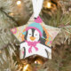 Pinguins bonitos no chapéu de inverno e lendas auriculares na frente e no verso de um ornamento em forma de estrela com texto tipográfico e fundo polka pontilhado. Nós temos esses pinguins bonitos em combinar cobertores, cartões de saudação, envelopes, etiquetas de endereço de retorno, saias de árvore, adesivos e selos postais!