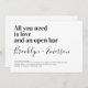 Convide amigos e família para se juntarem a vocês para suas celebrações de casamento com este divertido convite para o casamento. O texto diz "tudo o que você precisa é amor e um bar aberto"
