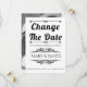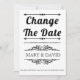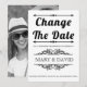 Vintage elementos e casamento de tipografia em preto e branco Mude o anúncio de adiamento de data. Este elegante design de casamento exibe o texto "Alterar a Data" em negrito tipografia negra e elementos de vintagem que formam quadros para o texto. A parte de trás apresenta uma foto do casal.