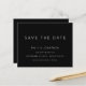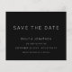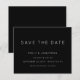 Simples Tipografia Branca Casamento Preto Salva A Data. Um alternativo de 4,5 pol x 5,6 pol com preço inferior. Disponível em um STOCK DE CARTÃO SEMI-GLOSS 110 lb, que é a opção padrão (mais espesso para convites), OU um STOCK de PAPEL THINNER FINISH 80 lb FINISH (ideal para gabinetes). Os envelopes são um extra opcional e são ligeiramente maiores que o tamanho da placa. Totalmente personalizável. .Mostrado aqui em branco a preto, entretanto, as cores de texto e fundo podem ser alteradas se você desejar por meio da opção personalizar mais.
