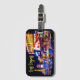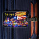 Etiqueta de Bagagem com luzes de Las Vegas Strip à noite com trânsito em movimento e sinais coloridos de neon, além da Torre Eiffel iluminada. O texto é totalmente personalizável
