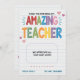 Diga obrigado de você de uma forma brilhante e alegre com este adorável cartão de reconhecimento de "Professora Incrível"! Apresentando letras coloridas no arco-íris num fundo estilo notebook, este cartão de feriado plano é perfeito para o final do ano letivo, Semana de Apreciação do Professor, ou apenas por causa disso. Personalizado com o seu nome e o do seu professor, é uma maneira sincera de os alunos expressarem gratidão por todo o trabalho de duro, encorajamento e apoio que recebem na sala de aula. Ideal para crianças do ensino fundamental, famílias de escolas de casa, ou qualquer pessoa que queira celebrar um professor verdadeiramente incrível. Inclui espaço para sua própria mensagem personalizada e entrega com um envelope correspondente.
