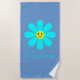 Coloque seu nome em uma toalha de praia! Esta linda toalha de praia tem uma margarida aqua com um rosto feliz sorridente e um texto personalizado para seu nome ou monograma em um fundo de cinza azul.