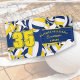 Esta legal toalha para jogadores de vôlei apresenta várias dimensões: azul, ouro e volichões brancos virados em todos os sentidos, sobre um fundo branco e um proeminente número de jersey em ouro sobre uma cheio azul, corajosa, sobre a qual você também pode personalizar o nome do atleta, o nome da equipe e o nome do mascote - por katz_d_zynes