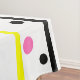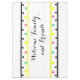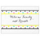 Bem-vindos, família e amigos são escritos em bonito roteiro preto. Mesa de pano com padrão geométrico colorido com bordas riscadas amarelas cor-de-rosa, amarelas, azuis turquesas, bolinhas pretas e amarelas ensolaradas. O fundo é branco. Formas circulares brilhantes e de moda fresca para os meses de primavera e verão para iluminar a decoração da cozinha. Design de arte original © TamiraZDesign. www.zazzle.com/tamirazdesigns
