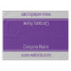 Esta toalha de mesa roxa e cinza tem um modelo de texto. Há quatro linhas de texto de exibição para suas mensagens personalizadas, como nome de empresa e site. Todo o texto pode ser editado ou excluído.