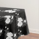 Monte uma mesa deslumbrante para o seu casamento preto e branco ou outra ocasião ou celebração. Este elegante pano de mesa apresenta um fundo preto com uma sobreposição de flores de peônia brancas com folhas cinza-prata.
