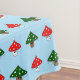 Um padrão de cartoons festivos cogumelos. Um tem boné como uma árvore de Natal e o outro tem boné como um chapéu de Papai Noel. O fundo é azul claro.