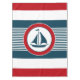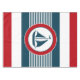 Design náutica com decoração em forma redonda de embarcações à vela, em fundo listrado, a azul, vermelho e branco