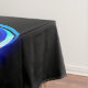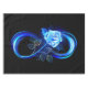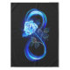 Luminous infinity symbol with glowing, beautiful, lushly blooming rose made of blue flames on black background.
