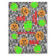 Divertido decoração de Halloween. Bombas laranja com olhos vermelhos, abóboras zombie verdes com aparência de gotículas de sangue. Texto festivo em texto vermelho, Boo, Eek, Feliz Dia das Bruxas, Trick-or-Treat. O fundo é quadrado preto de cinzas com branco. Design original © TamiraZDesign.