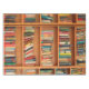 Livros educativos sobre biblioteca escolar numa prateleira de madeira castanha para professores, estudantes e livrarias.