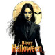 Ilustração estilizada de uma misteriosa bruxa parada debaixo de uma lua de cheio brilhante, com morcegos voando por aí e uma mensagem assustadora de "Feliz Dia das Bruxas".