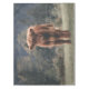 Foto do campo de grama do vitelo da Highland. Vitelo jovem espantoso de gado escocês de terras altas num campo de prado de outono com cores mudas. Belo casaco de laranja escuro e peludo contrastando com grama verde-clara e com árvores no fundo do boque.