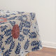 Seamless floral pattern featuring stylized dark blue leaves and multi-colored flowers in muted terracotta, gray, and white against a beige background.