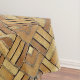 Bricks laid in parquet pattern is tiled. Bricks are in shades of yellow, orange, brown, and red.