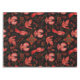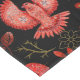 Vibrant red birds with detailed patterns are set against a black background, surrounded by intricate floral and leafy designs, creating a lively, ornamental scene.