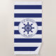 Personalize esta toalha náutica com seus nome do barco e ano de estabelecimento. Características de design a roda de um capitão dos azuis marinhos com uma beira circular da corda. O fundo é listras azuis e brancas. Tome-o à praia ou ao estoque acima de seu barco com eles para convidados. Faz o presente perfeito para amantes do barco.