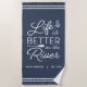Atualize sua configuração ao ar livre na sua borda ribeirinha com esta linda toalha de praia personalizada com a frase "A vida é melhor no rio" em letras brancas acentuadas com uma âncora e um remos. Personalize com seu nome de família e/ou ano estabelecido abaixo. Excelente para o aquecimento doméstico, casas de verão ou aluguéis de férias.