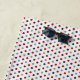 Toalha de praia com bolinhas náuticas de cor vermelha e azul em branco.