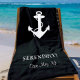 Uma toalha de praia com tema náutico moderno para o seu barco que apresenta uma ilustração branca de uma âncora num fundo preto. Personalize o nome e a localização do seu barco em tipografia branca elegante.