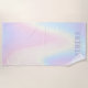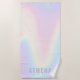 Toalha de praia com um fundo de arco-íris pastel macio e seu nome em roxo claro.