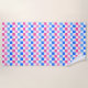 A checkerboard pattern of pink, blue, and white squares creates a vibrant and lively visual effect, conveying playfulness and energy.