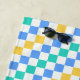 A colorful checkered pattern with alternating blue, green, and yellow squares on a white background. The design is vibrant and geometric, creating a playful tone.