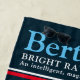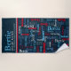 Typographic short name blue, red, white text on a dark blue background custom name meaning beach towel. Background color can be changed if required. Fun personalized graphic text personalized towel. Personalize with your own short name and name meaning or other words, currently reads Bertie Bright raven. An intelligent, magnificent warrior. © Art and design and name meaning by Sarah Trett for www.mylittleeden.com
