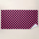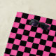 A vibrant checkerboard pattern of black and bright pink squares, creating a visually striking and bold contrast. The design is uniform and symmetrical.