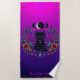 Black Cat Celestial Mystical Beach Towel features an enchanting black cat surrounded by moon phases, stars, flowers, crystals, and magical botanical details on a vibrant purple and pink background. This mystical fantasy design blends celestial, witchy, and gothic-inspired elements for a bold, colorful look that feels both dreamy and magical. A beautiful choice for black cat lovers, moon gazers, crystal lovers, and anyone drawn to mystical, spiritual, or celestial artwork.