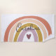 Peach Pastel Boho Rainbow Name Beach Towel em tons de rosa, pincel, mostarda, lavanda e pêssego apresenta uma ilustração fofa de um arco-íris.