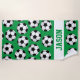 Aqui está uma toalha de praia divertida para qualquer jogador de futebol. Ele apresenta um padrão aleatório de bolas de futebol em um fundo verde. Personalize com o nome de sua escolha, que aparecerá em verde contra uma banda branca próxima à parte inferior da design.