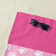 Padrão de impressão de pata branca em uma cor de fundo rosa. O topo e o fundo têm bordas rosa mais escuras. Na parte inferior há também uma silhueta de osso de cão branco com uma área de texto personalizável para um nome.