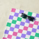 A vibrant checkerboard pattern featuring alternating pastel purple, pink, and green squares against a white background, creating a playful, colorful effect.