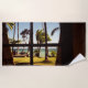 Cena de praia tropical de Fiji - Fotografia de uma praia nas Ilhas Fiji com palmeiras, hammocks e um banco de piquenique vistos através dos persianas abertos de uma cabana de praia. © Alan Harman Fotografia 2004. Todos os direitos reservados. www.alanharmanphotography.com 120418 toalha de praia