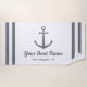 A toalha de praia náutica em formato horizontal apresenta uma âncora elegante de barco com faixas horizontais pré-definidas. Personalize o texto personalizado com o nome e a localização do barco. Design inclui uma cinza costeira clássica e um esquema de cor branca.