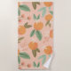 Esta toalha de praia apresenta um padrão ilustrado e colorido de laranjas, flores tropicais e folhas sobre o fundo de uma rosa claro.