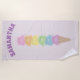 Mantenha seu legal na praia ou na piscina com esta toalha de praia personalizada bonito super que caracteriza um cone alto extra colorido arco-íris do sorvete com urso bonito as colheres dadas forma do sorvete. Personalize facilmente o texto roxo com esse special alguém nome usando o campo do modelo. Esta toalha de praia do divertimento faz um grande presente para fãs de brinquedos moles da comida. Encontre produtos de coordenação no bonito bastante para comer a coleção do design do asterisco.