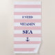 Esta bela toalha de praia é uma inscrição azul marinho com uma ilustração de âncora num fundo listrado rosa e branco.