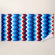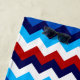 A beach towel featuring a colorful, cute pattern design of red, white, and blue chevrons.