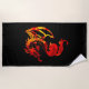 design decorativa de um dragão mítico alado, lagarto ou serpente em chamas como vermelho e laranja numa toalha preta de praia.