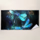 Duas libélulas transparentes, luminosas, turquesas, desenhadas artisticamente sobre fundo noturno, com algas e vagalumes luminescentes do lago. Dragonfly brilhante.