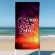 Preciso De Uma Torre De Praia Personalizada Engraçada E Engraçada No Mar De Vitamina. Este design apresenta um pôr do sol laranja e roxo com palmeiras.