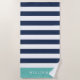 A toalha de praia personalizada e pré-disquete em aqua e marinho apresenta listras azuis e brancas de marinho largo clássicas, com seu nome ou escolha de personalização embaixo em letras brancas em negrito, em uma banda de tartaruga de verão.