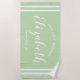 Toalha de praia personalizada para o fim de semana de férias de meninas apresenta um primeiro nome personalizado em escrita moderna emoldurado por listras costeiras, com texto personalizado para a ocasião. A cor de fundo verde menta pode ser modificada. Por favor, visite nossa loja para outras opções de cores.