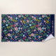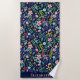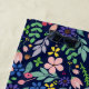 Floral com folhagem flutuante, flores estilizadas bonito, folhas, bagas, bolotas e bolinhas de acentos em tons de verde, azul, rosa, roxo e amarelo com acentos em laranja, vermelho e castanho. Preso sobre fundo azul escuro. Use as modelos para personalizar com seu nome ou mensagem em fonte rosa em uma faixa azul escura.