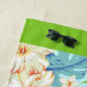 Flores bonitas e folhas tropicais grandes são a principal característica dessa design de toalha de praia. As bordas superior e inferior são verdes escuras.