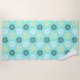 Toalha de praia com um oceano divertido inspirou um padrão de flores feito de pequenos cavalos marinhos em aqua branco, amarelo e escuro em um fundo aqua claro.