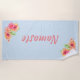 Toalha de praia com tema ioga bonito feita em azul claro, com gráficos de flores tropicais coloridas. O texto colorido coral lê Namaste e pode ser personalizado para ler o que você deseja.